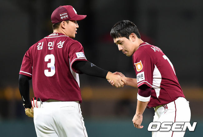 2회초 공수교대때 197안타를 기록한 넥센 서건창이 김민성의 축하를 받고 있다. 서건창은 지난 1994년 해태 이종범(현 한화 코치)가 작성한 한 시즌 최다안타(196개.124경기)를 넘어 신기록을 작성했다. 이종범과 똑같이 124경기만에 196안타를 기록한 서건창은 125경기만에 한국야구사의 신기원을 열었다.