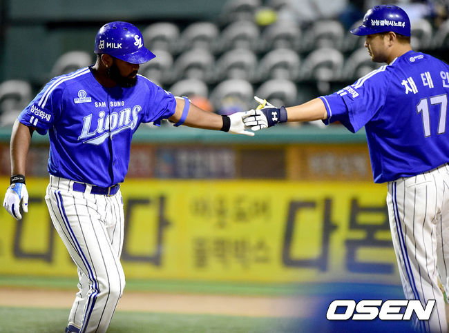 2회초 삼성 공격 1사 주자없는 상황 나바로가 좌중간 솔로포를 날리고 홈을 밟은 뒤 채태인과 인사를 나누고 있다.