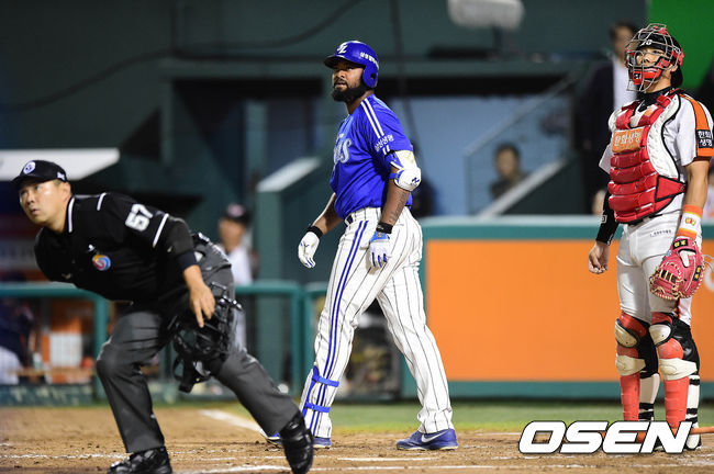 3회초 삼성 공격 1사 1,2루 상황 나바로가 좌월 투런포를 날리고 타구를 바라보고 있다. 이 타구는 합의 판정 끝에 홈런으로 인정.
