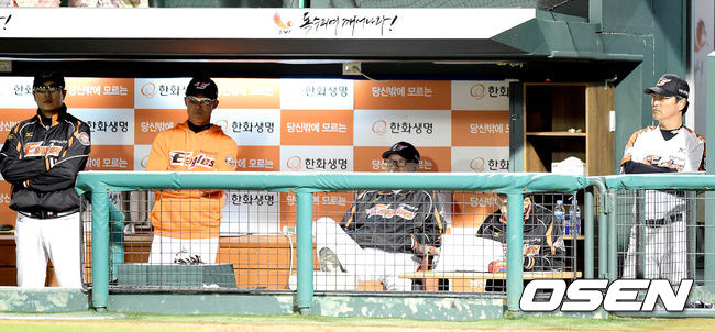 3회초 삼성 공격 때 8실점 하며 점수차가 크게 벌어진 한화의 김응룡 감독을 비롯한 코칭스태프가 굳은 표정으로 경기를 지켜보고 있다.