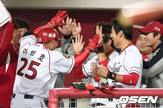 3회말 2사 1루에서 KIA 이범호가 역전 투런 홈런을 치고 더그아웃에서 동료들의 축하를 받고 있다.