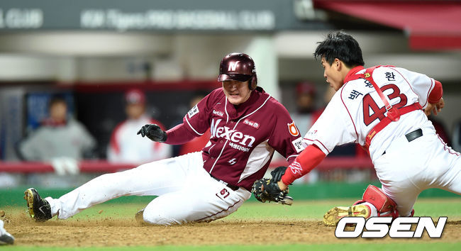 5회말 2사 1,2루에서 넥센 강정호의 적시타때 유한준이 KIA의 송구 실책을 틈타 홈으로 쇄도했지만 아웃되고 있다.