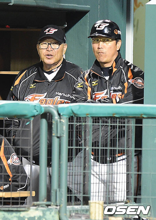 한화 김응룡 감독(사진 왼쪽)과 강석천 코치가 자리에서 일어나 경기를 지켜보고 있다.