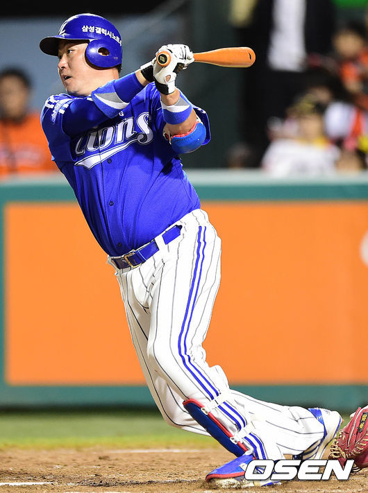 5회초 삼성 공격 2사 1, 2루 상황 진갑용이 적시 2타점 중전안타를 날리고 있다.