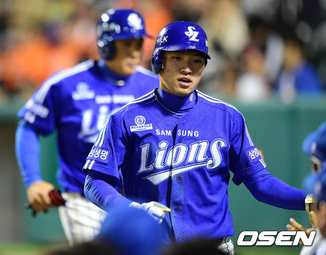 5회초 삼성 공격 2사 1, 2루 상황 진갑용의 적시 1타점 중전안타와 상대 실책으로 홈을 밟은 박해민과 이승엽이 더그아웃 동료들과 인사를 나누고 있다. 삼성은 이 득점으로 5회초 현재 15득점을 기록하고 있다.