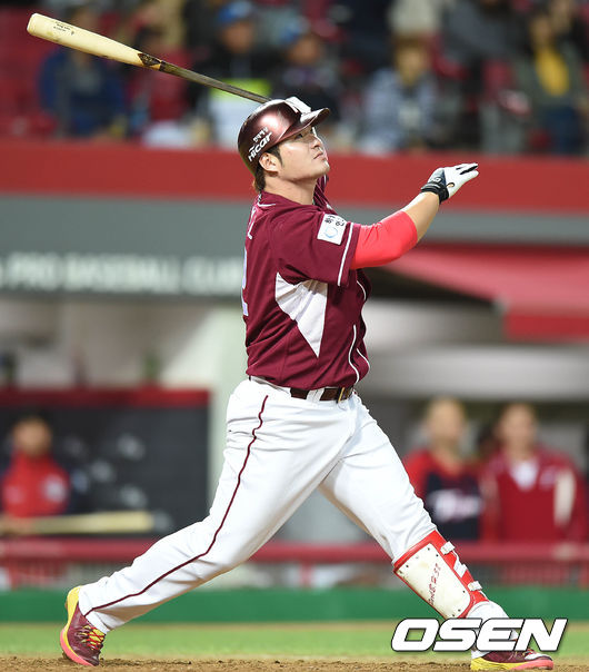 5회초 1사 1,2루에서 넥센 박병호가 외야플라이를 치고 있다.