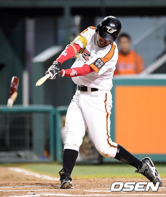 6회말 한화 공격 1사 주자없는 상황 김경언이 중전안타를 날릴 때 배트가 부러지고 있다.