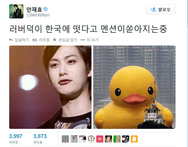 러버덕 프로젝트가 오는 14일부터 한 달 동안 서울 석촌호수에서 진행되는 가운데, 블락비 재효가 팬들에게 많은 멘션을 받았음을 공개해 웃음을 자아내고 있다.