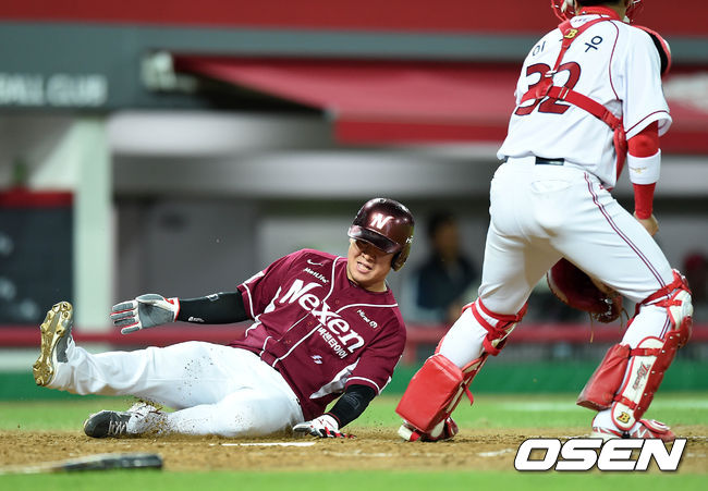 8회초 2사 1루에서 넥센 이성열의 적시타때 1루주자 김민성이 홈을 밟고 있다.