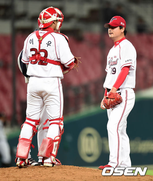8회초 2사 1루에서 넥센 이성열에게 적시타를 허용한 KIA 최영필이 마운드를 방문한 포수 이성우와 이야기를 나누고 있다.