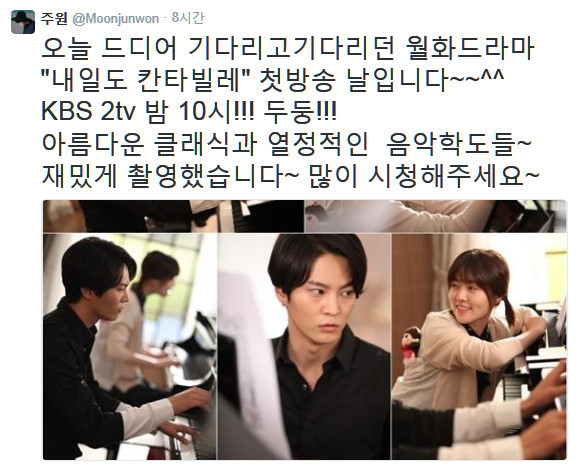 주원은 13일 오후 자신의 트위터에 “오늘 드디어 기다리고 기다리던 월화드라마 "내일도 칸타빌레" 첫 방송 날입니다. KBS 2TV 밤 10시. 아름다운 클래식과 열정적인 음악학도들. 재밌게 촬영했습니다. 많이 시청해주세요”라는 시청 독려글을 게재했다.