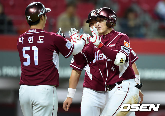 9회초 1사 1,2루에서 넥센 유한준이 좌월 스리런 홈런을 치고 홈에서 박헌도, 박동원과 하이파이브를 하고 있다.