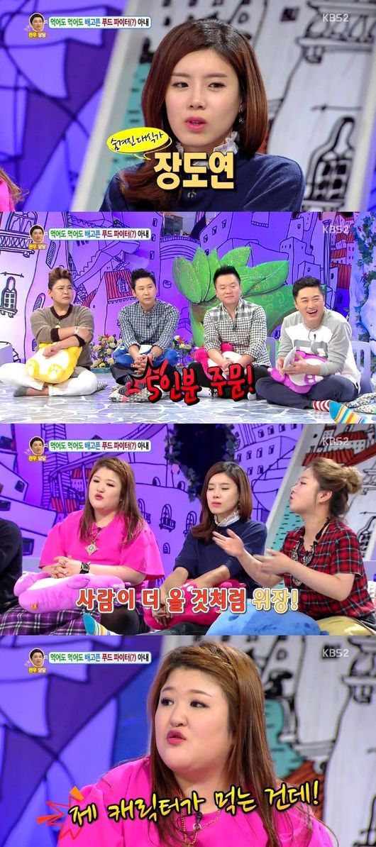 박나래는 13일 오후 방송된 KBS 2TV 예능프로그램 '대국민 토크쇼 안녕하세요'(이하 '안녕하세요')에서 식욕이 왕성한 아내의 사연을 들은 후 "진짜 푸드 파이터는 장도연이다"라고 말했다.