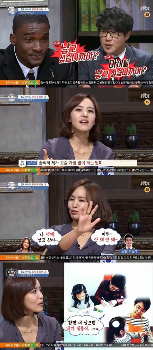 샘 오취리는 본격적인 논의에 앞서 “아이를 더 낳고 싶냐”고 질문했다. 이에 다섯 살 다인이와 8개월 이안이의 엄마인 박지윤은 “요즘 제가 제일 하는 말이 ‘셋째 낳고 싶다’다. 근데 셋째를 낳고 싶다고 하면 남편이 질색을 한다. 한명 더 낳으면 내가 더 힘들 것 같다는 말을 한다”고 말해 눈길을 끌었다.