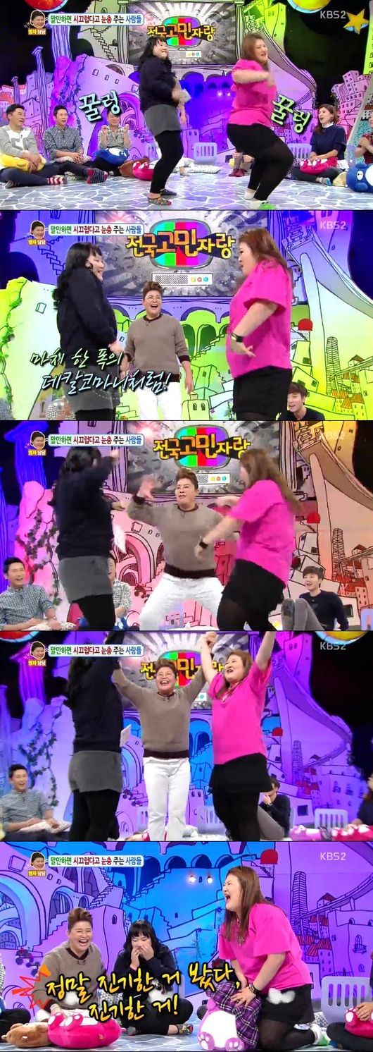 두 사람의 모습을 지켜 본 이영자는 두 여인의 댄스 타임에 합류해 함께 춤을 췄고 신동엽과 컬투 등 MC들은 "진기하다"고 감탄했다.