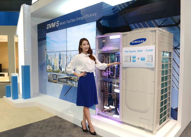 삼성전자 모델이 14일 삼성동 COEX에서 열린 '2014 대한민국 에너지대전'에서 세계 최대 수준 용량(75.4kW(26마력))의 '시스템에어컨 대용량 DVM S'를 소개하고 있다. /삼성전자 제공.
