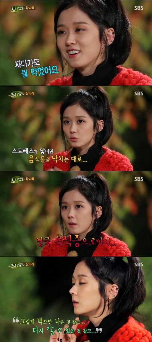 또한 장나라는 “냉장고에서 가져와서 먹지 않고 냉장고를 열고 그 앞에서 허겁지겁 먹었다”며 “먹으면 나아지는 것 같고 잘 수 있을 것 같더라”라고 말해 놀라움을 자아냈다.