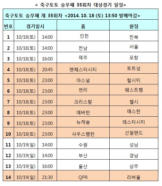 이밖에 맨체스터시티-토트넘(4경기), 아스널-헐시티(5경기), QPR-리버풀(14경기) 전 등이 대상경기로 선정됐다. 축구토토 승무패 35회차 게임은 오는 18일 오후 1시 50분 발매가 마감된다.