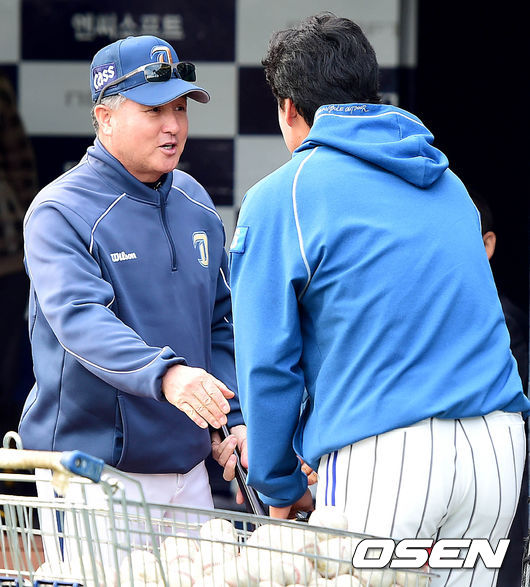 14일 오후 경남 창원시 마산구장에서 열리는 '2014 한국야쿠르트 세븐 프로야구' NC 다이노스와 삼성 라이온즈의 경기를 앞두고, NC 김경문 감독과 삼성 이승엽이 인사를 나누고 있다.