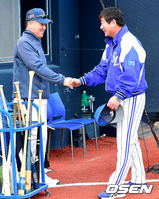 14일 오후 경남 창원시 마산구장에서 열리는 '2014 한국야쿠르트 세븐 프로야구' NC 다이노스와 삼성 라이온즈의 경기를 앞두고, NC 김경문 감독과 삼성 류중일 감독이 인사를 나누고 있다.