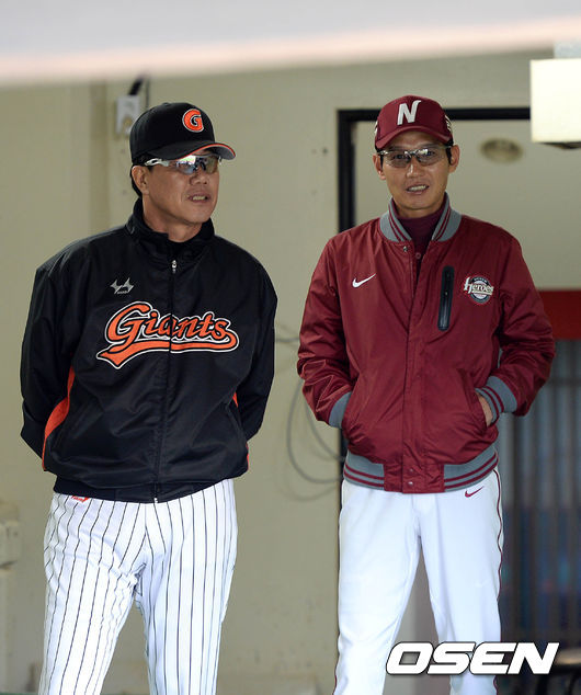 14일 오후 부산 사직야구장에서 진행될 '2014 한국야쿠르트 세븐 프로야구' 롯데 자이언츠와 넥센 히어로즈의 경기에 앞서 롯데 김시진 감독과 넥센 염경엽 감독이 이야기를 나누고 있다.