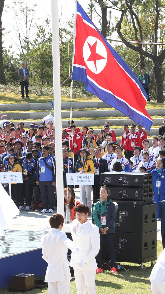 정현 선수단장을 비롯한 북한 선수단 29명은 이날 오전 11시 인천 남동구 구월아시아드 선수촌 국기광장에서 라오스, 시리아, 싱가폴, 인도, 차이니스 타이페이 등 5개국 선수단과 함께 공동으로 입촌식을 치렀다.