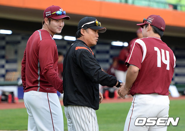 14일 오후 부산 사직야구장에서 진행될 '2014 한국야쿠르트 세븐 프로야구' 롯데 자이언츠와 넥센 히어로즈의 경기에 앞서 롯데 박흥식 코치가 넥센 박병호, 서건창과 이야기를 나누고 있다.