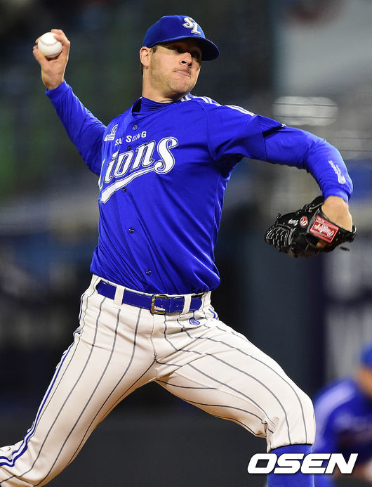 삼성 선발 밴덴헐크가 힘차게 공을 뿌리고 있다.