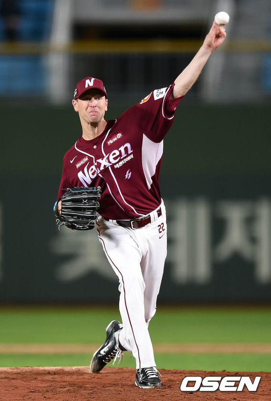 1회말 무사에서 넥센 밴헤켄이 힘차게 공을 던지고 있다.
