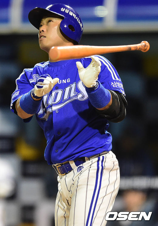 2회초 삼성 공격 2사 주자없는 상황 김태완이 선제 좌월 솔로포를 날리고 있다.