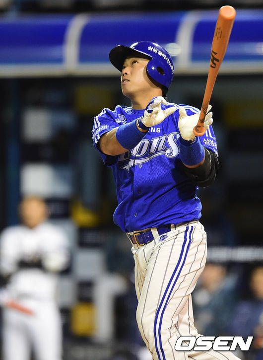 2회초 삼성 공격 2사 주자없는 상황 김태완이 선제 좌월 솔로포를 날리고 있다.