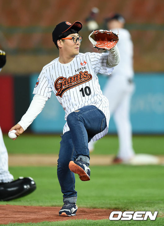 경기에 앞서 개그맨 이동엽이 시구를 하고 있다.