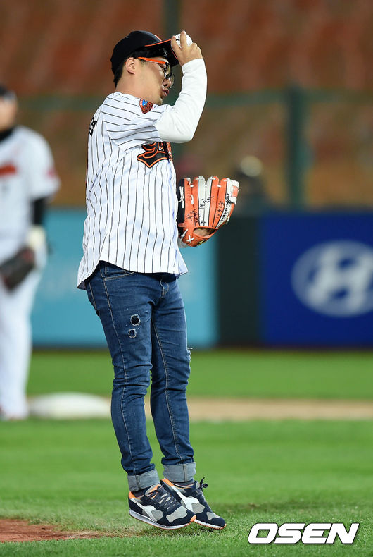 경기에 앞서 개그맨 이동엽이 시구를 하고 있다.