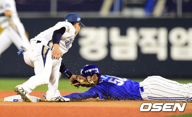 2회초 삼성 공격 2사 1루 상황 이지영 타석 때 주자 박해민이 2루 도루에 성공하고 있다.