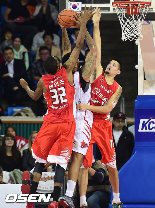 2쿼터, 오리온스 길랜워터가 SK 헤인즈와 김민수의 더블수비를 뚫고 슛을 시도하고 있다.