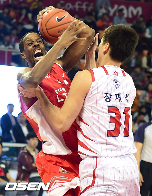 1쿼터, SK 헤인즈가 오리온스 장재석의 파울을 유도하고 있다.