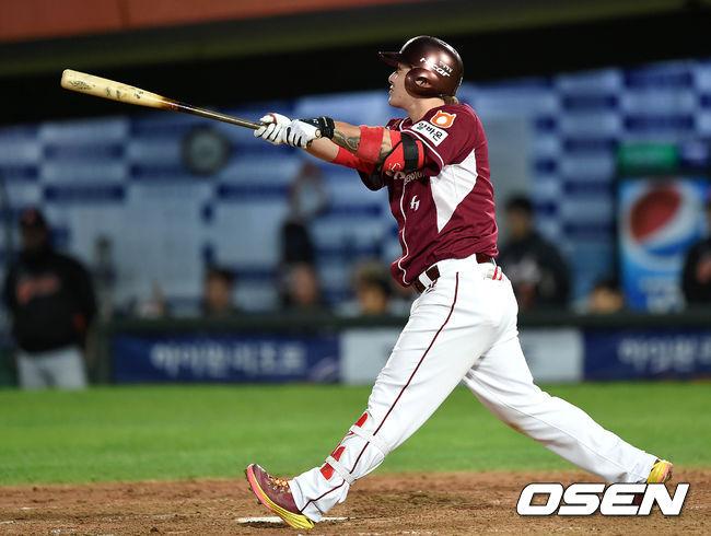 4회초 1사 1,2루에서 넥센 박병호가 우익수를 넘기는 2타점 적시타를 치고 있다.
