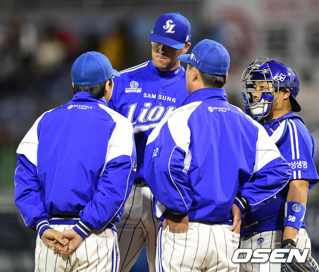 5회말 NC 공격 1사 1, 2루 상황 삼성 선발 밴덴헐크가 마운드에 오른 김태한 코치와 대화를 나누고 있다.