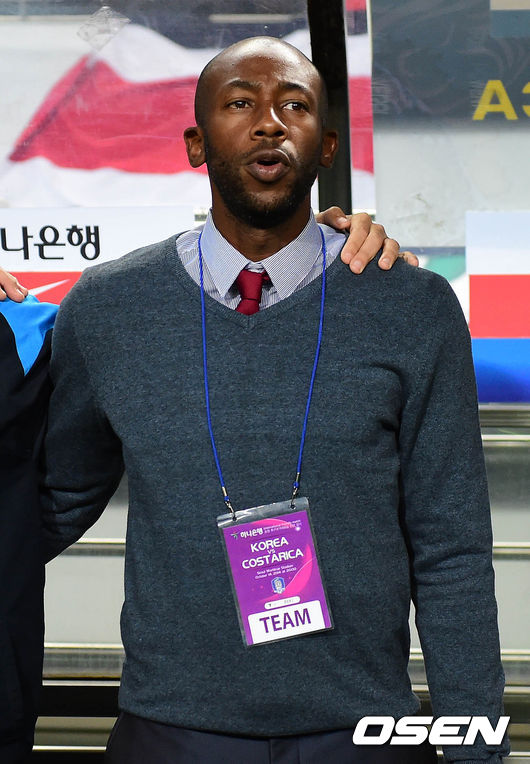14일 오후 서울월드컵경기장에서 열린 한국과 코스타리카의 평가전 경기 시작전 코스타리카 완초페 감독이 코스타리카 국가를 따라 부르고 있다.