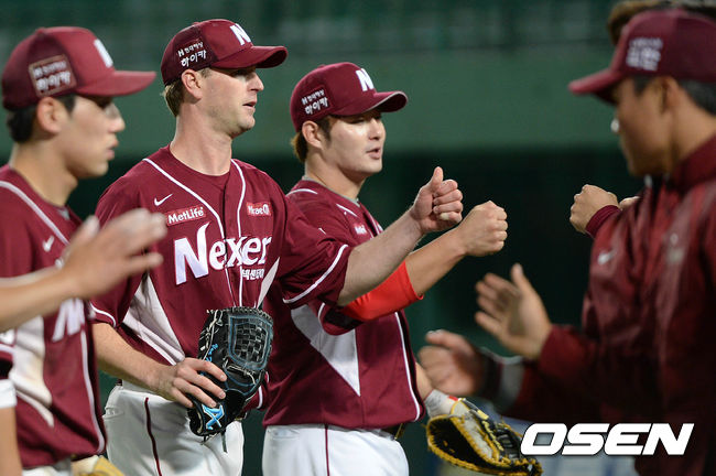 5회말 공수교대때 넥센 밴헤켄이 동료들과 하이파이브를 하고 있다.