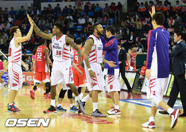 4쿼터, 작전타임을 위해 벤치로 들어오던 오리온스 선수들이 동료들과 하이파이브를 나누고 있다.