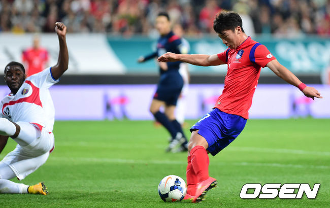 14일 오후 서울월드컵경기장에서 열린 한국과 코스타리카의 평가전 경기 전반 김민우가 슛을 시도하고 있다.
