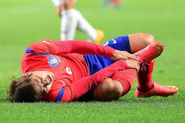 14일 오후 서울월드컵경기장에서 열린 한국과 코스타리카의 평가전 경기 전반 박주호가 라미레즈의 태클에 넘어져 고통스러운 표정을 짓고 있다.