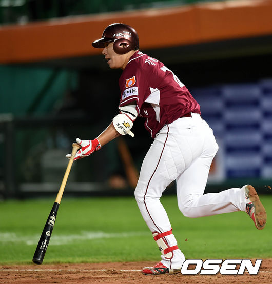 4회초 1사 3루에서 넥센 강정호가 좌전 적시타를 치고 있다.