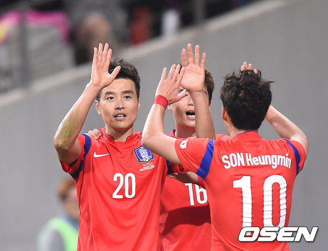14일 오후 서울월드컵경기장에서 열린 한국과 코스타리카의 평가전,전반 동점골을 성공시킨 이동국이 손흥민과 하이파이브를 하고 있다.
