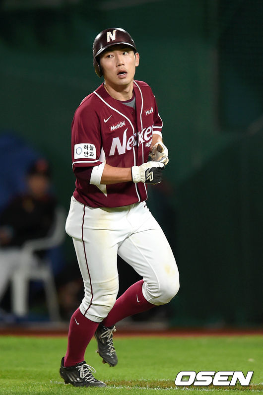 5회초 2사 1루에서 넥센 유한준의 중전 적시 2루타때 1루주자 서건창이 홈을 밟고 있다.