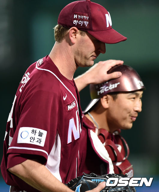 6회말 공수교대때 넥센 밴헤켄이 포수 허도환과 이야기를 나누며 더그아웃으로 가고 있다.