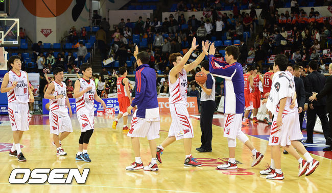 경기종료 후, 승리한 오리온스 선수들이 기쁨의 인사를 나누고 있다. /ouxou@osen.co.kr