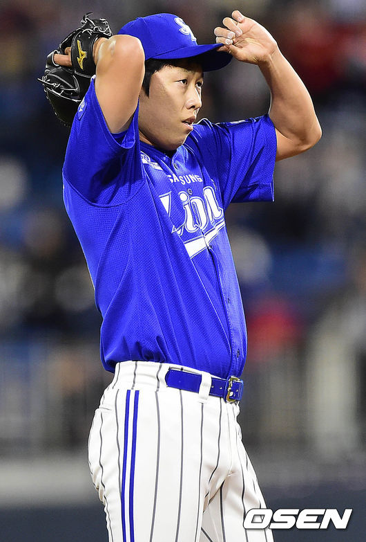 8회말 NC 공격 2사 2루 상황 이종욱에게 역전 1타점 우익선상 3루타를 허용한 삼성 투수 차우찬이 모자를 고쳐쓰고 있다.