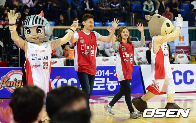 경기 시작에 앞서 AG펜싱 금메달리스트 구본길 김지연이 시구를 위해 코트로 들어서고 있다./ouxou@osen.co.kr